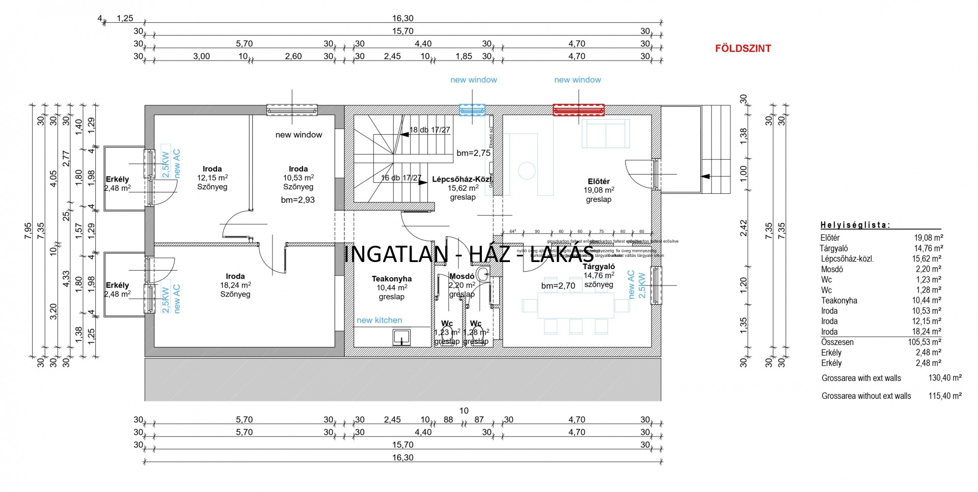 Fszt: 130m2 (3 db szoba/iroda, tárgyaló, előtér, teakonyha, mosdó, zuhanyzó, erkély)