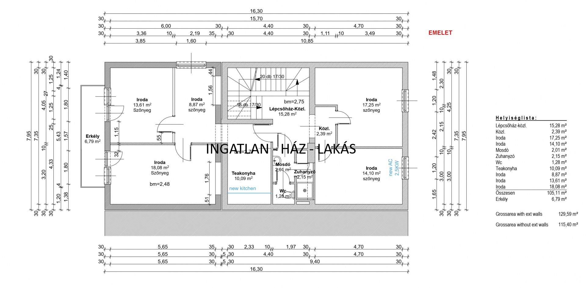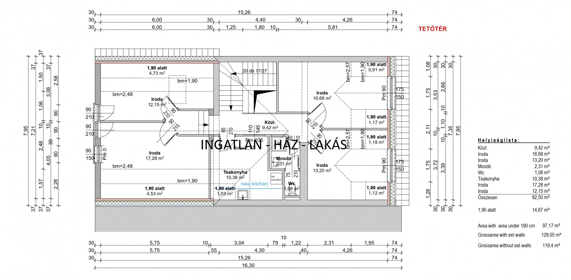 Tető tér: 130m2 (4 db szoba/iroda, teakonyha, mosdó)