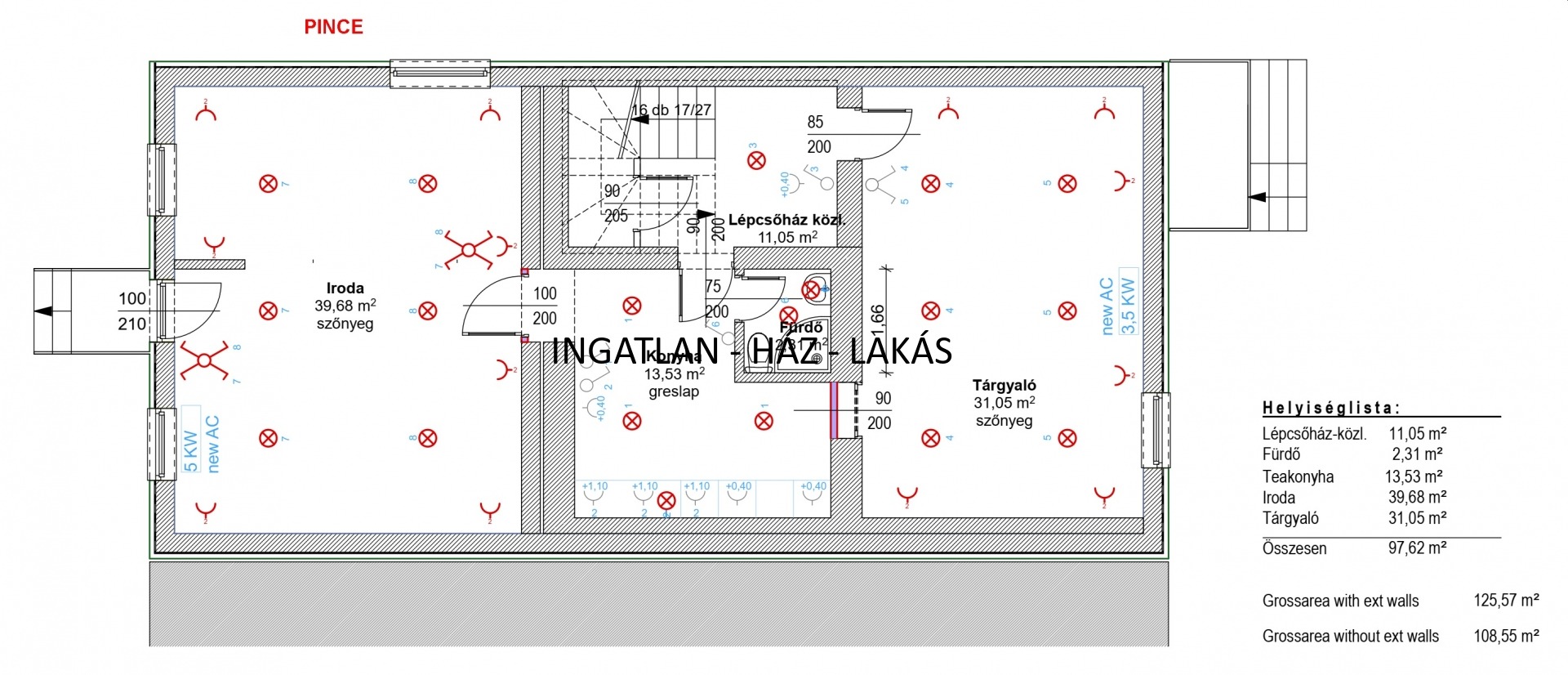 Pince: 125m2, (szoba/iroda, tárgyaló, teakonyha, mosdó, zuhanyzó)