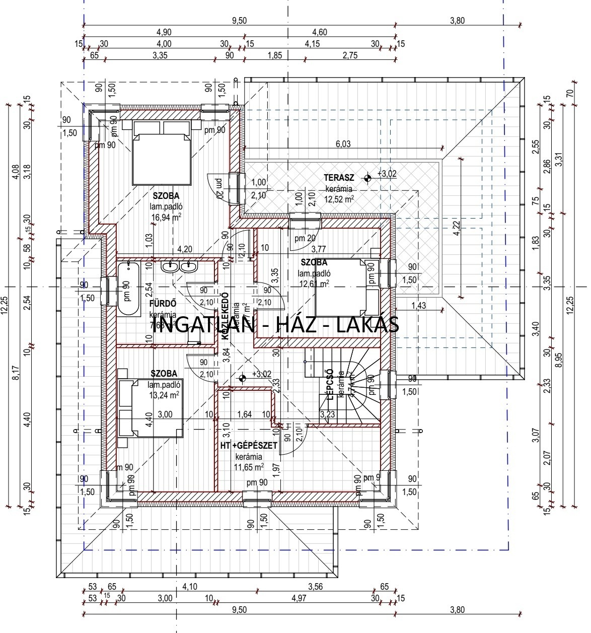 Az emeleten található 3 hálószoba, közlekedő és egy fürdőszoba. A szobákhoz tartozik egy hatalmas, 15 nm-es L alakú terasz, aminek a korlátja üvegből készült.