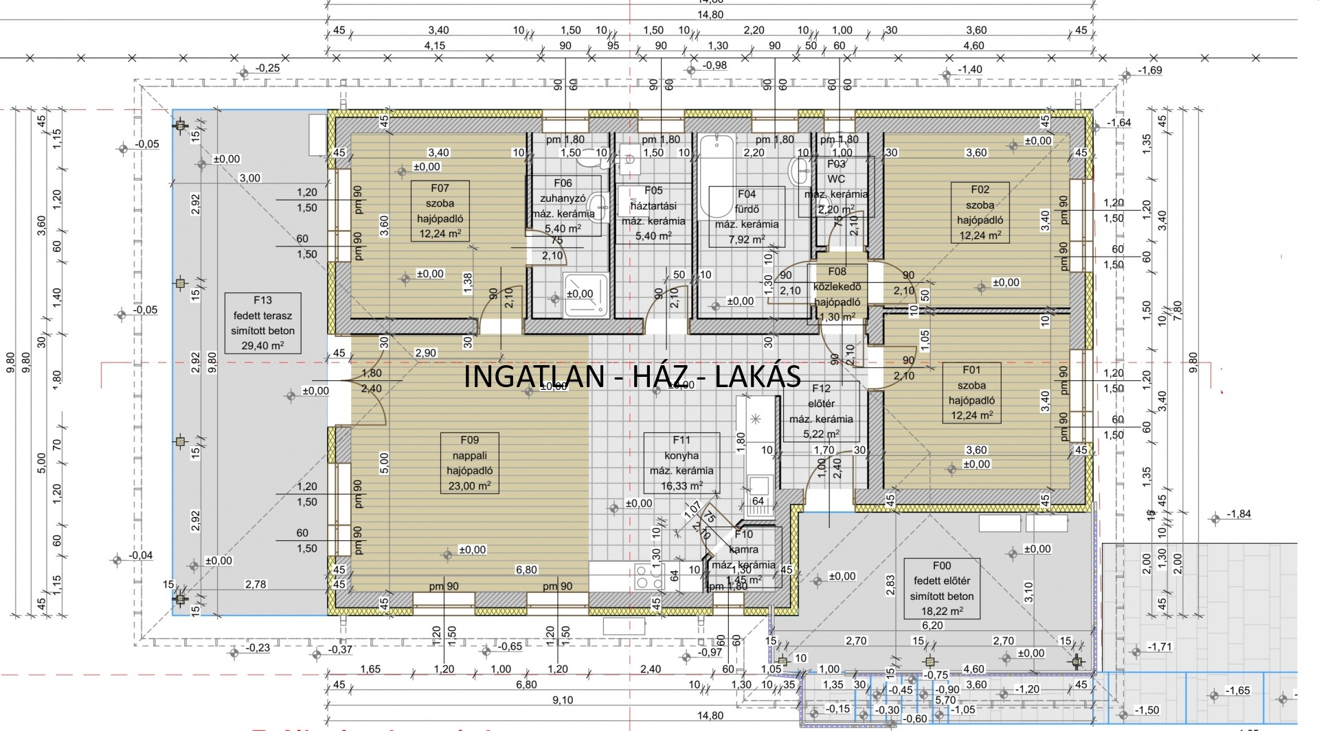 előszoba, amerikai konyhás nappali, háztartási helyiség, fürdőszoba, 3 háló szoba + FEDETT TERASZ 29 + 18 nm