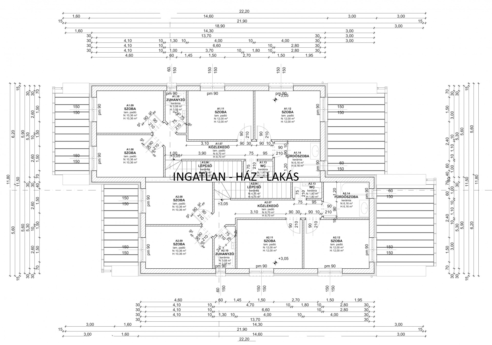 • 4 db szoba: 12 + 12 + 10,36 + 10,36 m²