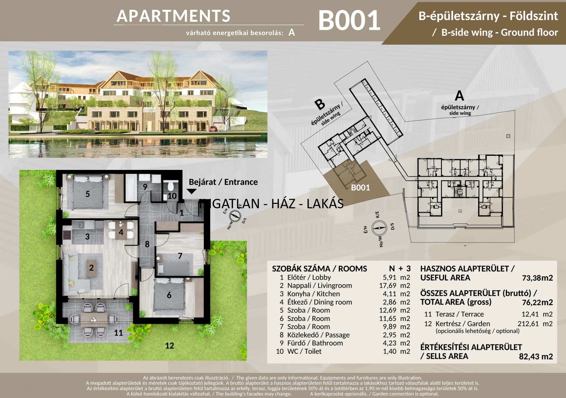 földszinten 76,22 m2-es nappali+ 3 szobás lakás, terasz 13 nm
