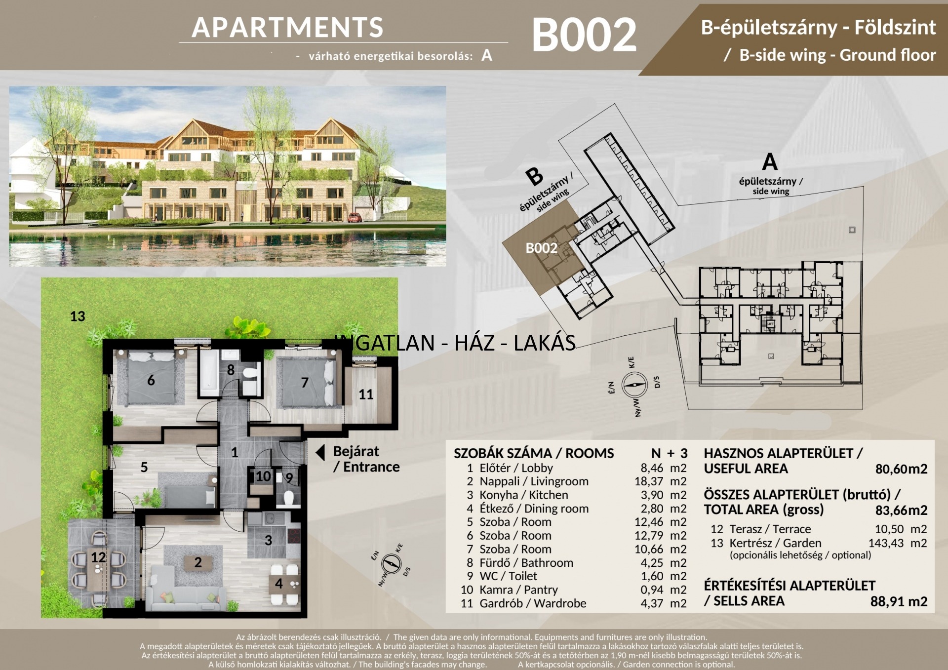 • Két modern épület (A és B) – harmonikus építészeti megoldásokkal
