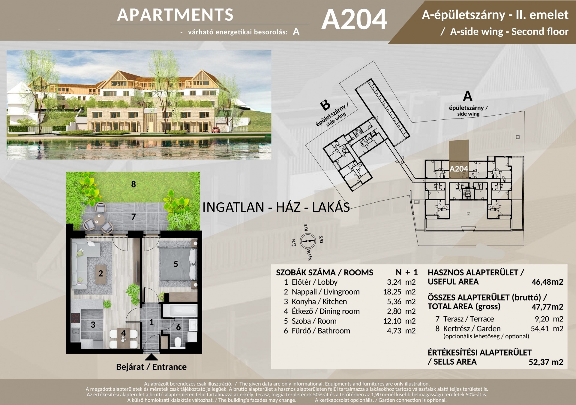 • Két modern épület (A és B) – harmonikus építészeti megoldásokkal